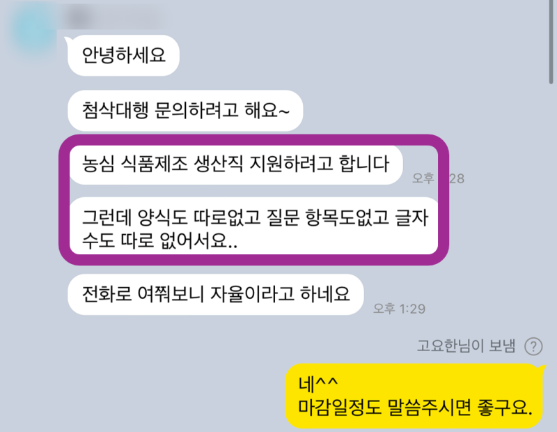 이번 지원자분은 농심 생산직에 지원하신 분이셨어요. 지방 국립대 졸업 후 관련 생산 현장에서 1년 정도의 경력을 쌓으셨지만, 자소서 작성에는 막막함을 느끼고 계셨습니다. 특히 생산직 직무는 **경험과 역량을 효과적으로 어필하는 것이 중요한데, 지원자분 스스로는 본인의 강점을 글로 풀어내는 데 어려움**이 많다고 하셨어요. 제가 처음 받아본 초안은 내용이 파편화되어 있고, 농심의 인재상과 연결성이 부족한 점이 눈에 띄었습니다. 글자 수도 채우지 못해 고민이 많으셨죠. 😥