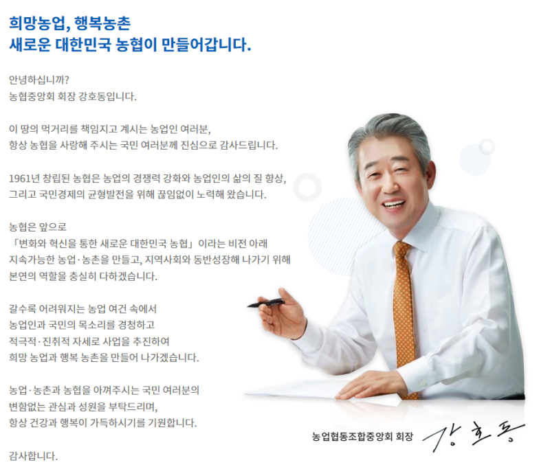 비전: 농업인과 고객에게 최고의 가치를 선사하는 글로벌 종합금융그룹 (농협금융지주 기준) / 고객의 삶과 함께하는 든든한 민족은행 (농협은행 기준)