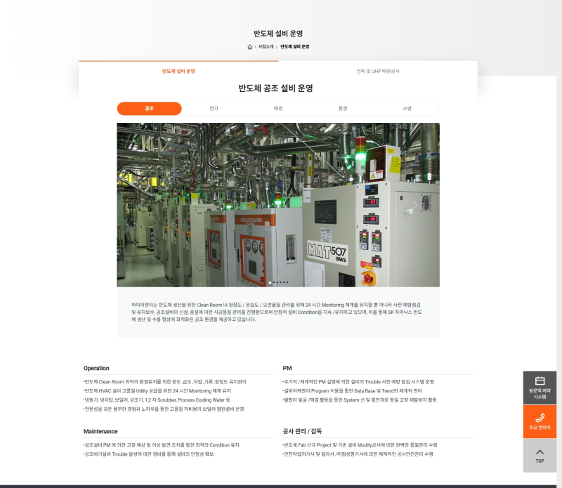 SK하이이엔지는 SK하이닉스의 제조 경쟁력을 강화하는 핵심 파트너로서, 반도체 생산시설의 인프라를 설계, 시공, 운영, 유지보수하는 종합 엔지니어링 전문 기업입니다. 특히, 반도체 생산에 필수적인 클린룸, 초순수, 특수가스, 전력, 공조 등 첨단 유틸리티 설비의 안정적인 공급과 효율적인 관리를 책임지며, 반도체 산업의 핵심 기반을 다지고 있습니다. 단순한 시설 관리를 넘어, 에너지 효율화 및 친환경 기술 도입을 통해 지속 가능한 미래를 선도하는 중요한 역할을 수행하고 있습니다. 🚀