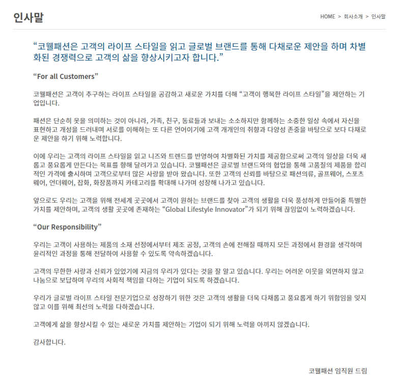 코웰패션은 ‘고객에게 최고의 가치를 제공한다’는 핵심 가치를 바탕으로 성장해 왔습니다. 지속적인 혁신과 고객 중심 경영을 통해 패션 업계를 선도하고 있으며, 글로벌 시장 진출을 적극적으로 추진하고 있습니다. 이러한 코웰패션의 비전을 이해하고, 자신의 역량을 발휘하여 함께 성장하고 싶다는 의지를 자소서에 녹여내는 것이 중요합니다.
