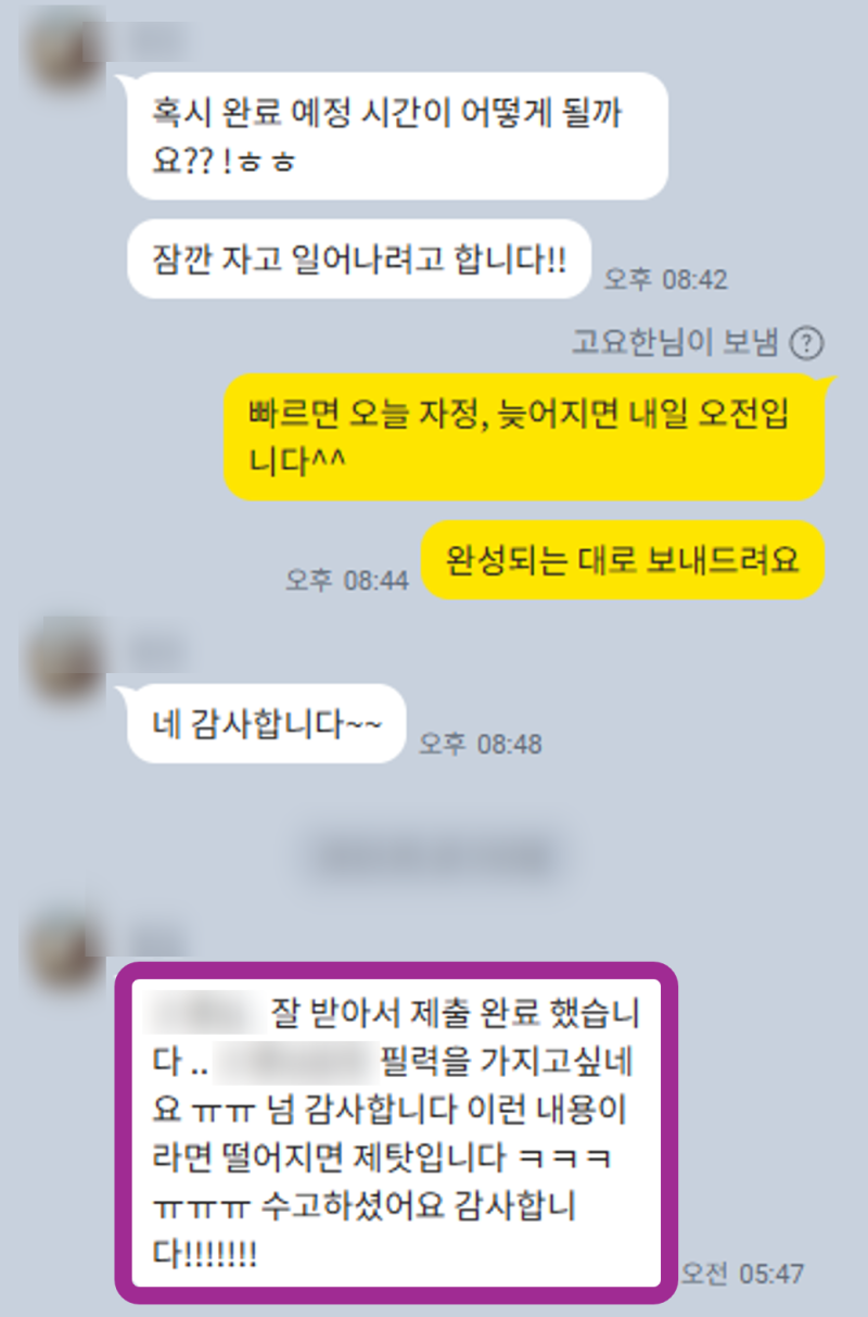다소 급하게 요청드리고 요청사항도 많았는데 친절하게 잘 작업해주셨습니다! 내용을 잘 구체화해 주셔서 작성에 도움이 된 것 같습니다. 감사드려요!